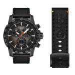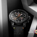 今回の特別モデルではこのクロノグラフに、コラボのために製作されたストラップをセット。風格漂うブラックレザーには、大会名とロゴマークをエンボス加工で刻印。コーナーステッチには、大会のメインカラーに由来するブルー/レッド/オレンジ/イエローの4色をあしらっています。時計本体との接続部には、交換容易なインターチェンジャブルシステムを採用しており、お好みのタイムピースに付け替える楽しみも提供。