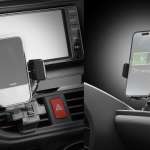どちらのタイプも、フロントパネルにはハニカムパターンとガンメタリックの塗装が施され、アームにはアクセントとなるブルーのLEDインジケーターを搭載。シンプルながら高級感のあるデザインは車内インテリアになじみやすく、LEDインジケーターがあることで、夜間でもホルダーの位置が分かりやすくなっています。