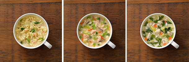 「鮭とキャベツの石狩鍋風しめ雑炊」(写真中)