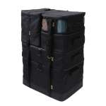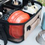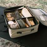 素材はやわらかいのですが、4つの側面に面ファスナーで“補強板”を入れることで、コンテナ内の形をキープする仕組み。中身の形がイロイロでもコンテナの形が崩れにくく、ハードコンテナのように積み重ねて置けます。補強板は取り外し可能なので、ソフトコンテナとしても使えるのも便利ですね。