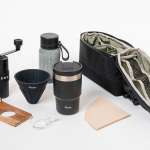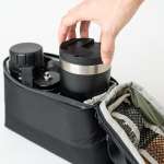 内部は大きく3つに仕切られていて、それぞれのコンパートメントにキャニスター、ミル、タンブラーをすっきり収納、サイドに設けたフラットポケットにはペーパーフィルターのほか、バネ式やシリコン製などフラットになるタイプのドリッパーが収納可能、さらにフタ裏には小物収納に便利なメッシュポケットも備えます。