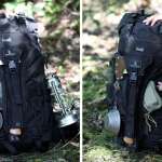 メイン収納部へのアクセスは、上部のロールトップ部分だけでなく、アックスホルダーの左右に付けられたファスナーでも可能に。これなら奥に入れたモノも、荷物をひっくり返さずに取り出せます。