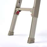 脚立の全体には粉体塗装が施されており、表面はマットな質感に。リベットなどの細かなパーツも別塗装されているほか、伸縮脚部分はカラーアルマイト処理によってベージュカラーが再現され、一体感のある仕上がりになっています。伸縮脚の操作レバーにはハセガワのコーポレートカラーである赤が使われていて、見た目でわかりやすいだけでなく、デザインのワンポイントに!