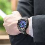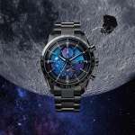 特に新モデルでは、再⽣ポリカーボネイトのベースに構造⾊インクを⽤ることで、光発電エコ・ドライブの働きを損なうことなしに、デザインとしての美しさを獲得。光の反射と屈折によってパープルからブルーへと⾊が変化するダイヤルに、さらにシルバーのラメを重ねることで、“HAKUTO-R”のランダーが旅した宇宙空間の神秘的なきらめきを表現しています。