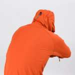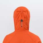 フードには、後ろと首の周りに搭載したふたつのドローコードと頭頂部のベルクロの3点でフィット感を細やかに調節できる、トライアクスルフードを採用。顔周りからの風の侵入も防ぎます。