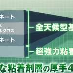 高耐久なポリエステルクロスを耐水ラミネートで挟んだ3層から形成される全天候型基材層と、超強力粘着剤層が合わさった厚手の4層構造となっており、粗面や凹凸面も強力に接着。漏れ出す水にも対応するなど、身近で起こるトラブルを一気に解決します。