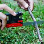 着火に関する機能は大きく4つ。ひとつ目は鋸(のこぎり)。小さいながらも新潟県燕市の燕三条で100年続く鋸メーカーが作成した本物の鋸。小さな木材や枝を切って火起こし用の着火材を作れます。