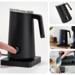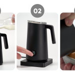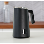 ポットのサイズは底面の直径10㎝×18㎝。このポットにミルクを入れ、フローサーの付いたフタを閉めてからベースにセットし、本体のボタンを押せばOK。全自動でミルクの加熱から攪拌までが完了し、なめらかな質感のフォームミルクが出来上がります。