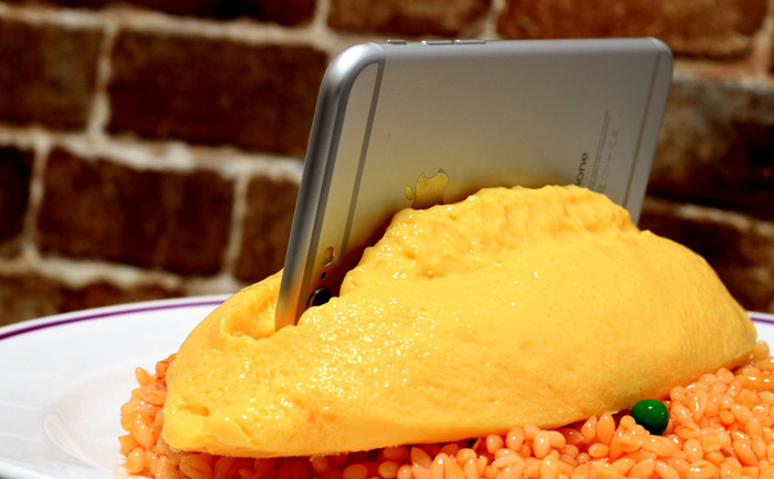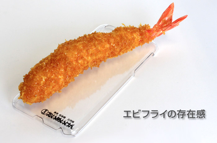 スマホがふわとろオムライスの上に鎮座? と思ったらぷりぷりエビフライが乗っかってる!?…はい、スマホスタンドとケースです。それにしても、オムライスの卵のふわとろ感、エビフライの衣の揚げたてサクサク感といったら、見ているとお腹がすいてくるほどリアル。