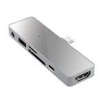 93×27mm、厚さ9.8mmの横長デザインで、長辺の中央にUSB Type-Cコネクタを搭載。逆側の長辺にUSB Type-C、USB Type-A、HDMIの各ポートとSDカードスロット、microSDカードスロット、さらにヘッドセット用3.5mmジャックを搭載。装着したまま使用しやすいよう、iPhone 15やiPadに直付けできるデザインになっています。