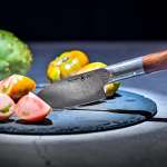 またハンドルには美しい木肌と強い耐久性を持つ、ウォールナットの木材を使用。ハンドル上部から中央まで続くボルスター部分と柄尻にもダマスカス鋼を使用し、握った時のバランスも抜群。カットするのにちょうど良い重さで、料理しやすい握り心地に仕上がっています。
