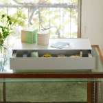 一見四角い箱のように思えますが、「KaKuKo」は幅300mmと幅600mmの小さな収納家具。上部のフチを手がかりにして引き出せば、収納スペースが現れる仕組みです。