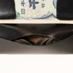 紙幣を折らずにピッタリと収納でき、9枚程度をしっかり収められるスペースを確保。コインケースも備わっており、1円から500円までさまざまな硬貨を織り交ぜて10枚程度が入る設計。コインケースはボタン等を使用せず、フラップを内側へ挿し込んでフタをするようにしたことで、薄さと使いやすさを両立させています。