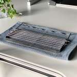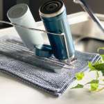 底面が高さのあるフレーム構造になっている点にも注目。これなら下に設置した吸水タオルにコップの飲み口が触れないので衛生的です。コンパクトに折りたためるので、引っ掛け収納にも対応します。
