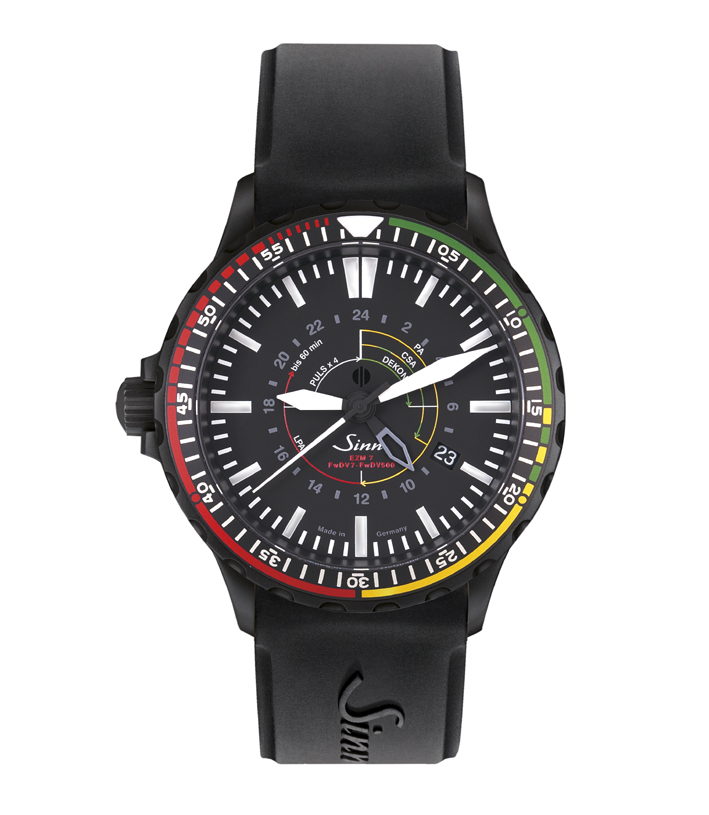 2011年に登場した「EZM7」は、消防士やレスキュー隊の過酷なシーンを想定して作られたモデルだ。キズ、温度変化、水や埃、磁気への耐性が高いのが特徴。3色に塗りわけられたベゼルが目を引くが、これはドイツの消防業務基準で定められた火災現場における活動時間を表すもの。また、海外派遣時の作業も考慮し、第二時間帯表示も備えている。