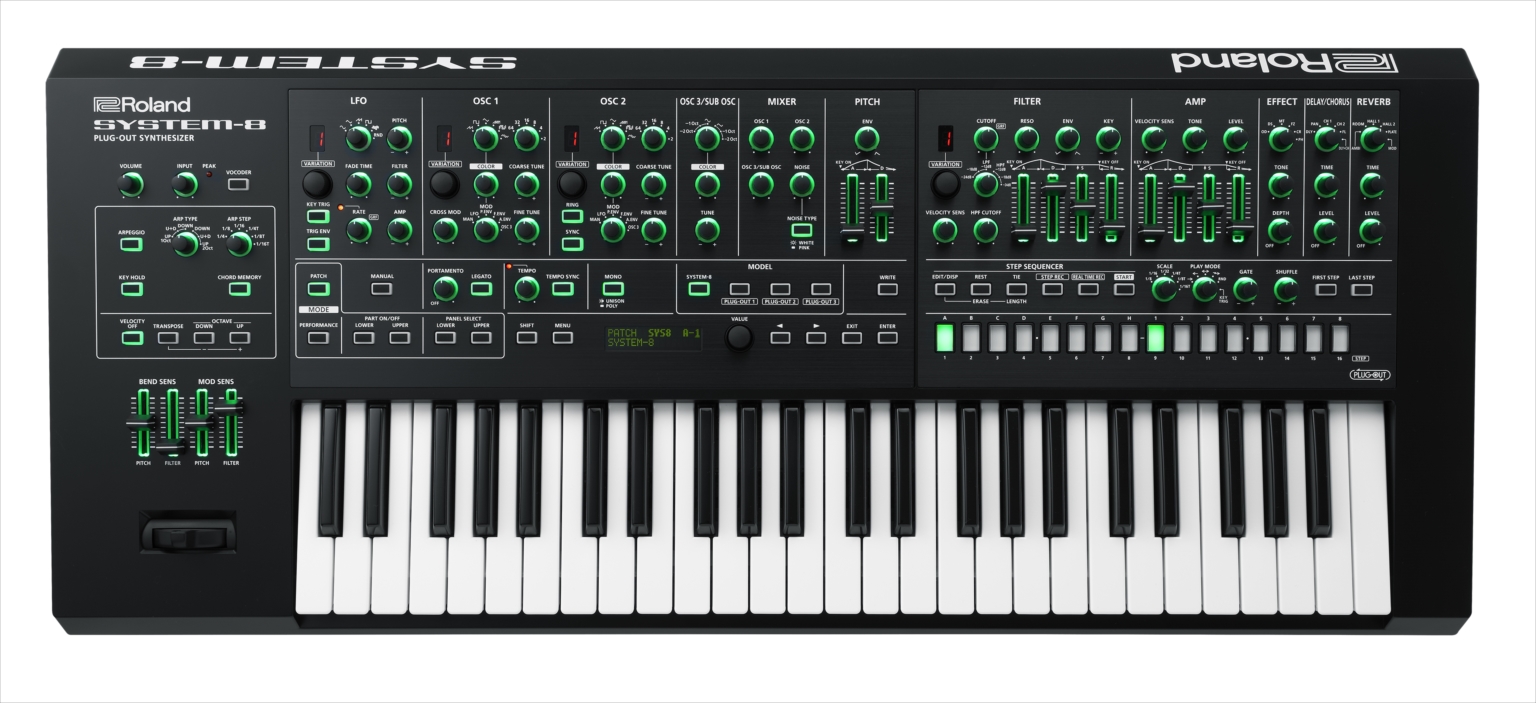 また、「SYSTEM-8」では、これまでリリースされたローランド初期の名機「SYSTEM-100」「SH-101」「PROMARS」などのプラグアウト用シンセや、今後リリース予定のものも含めて、最大4種類のサウンドを1台でコントロールすることが可能。さらに、それらのサウンドを自由に組み合わせることもできる。演奏性も重視し、8音ポリフォニック仕様で、鍵盤はベロシティ対応の49鍵キーボードを採用している。