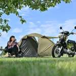 「neGla MAEHIROドーム」シリーズは、バイカーにとってちょうどいい居住性と使用感を目指して開発されたソロテント。ソロテントというと、開口部を大きくとった軍幕スタイル、あるいは携帯性に優れたミニマムサイズのアルパインテントなどが思い浮かびますが、オートバイを使った旅ではヘルメットやブーツ、グローブにジャケットと、案外かさばる装備が多いもの。思いもよらない天気の急変に遭遇したときも、オートキャンプのように「濡らしたくないモノはとりあえず車内に退避!」という訳にはいきません。