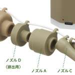 バルブがどんな形状でもスムーズに空気を入れられるよう、付属品として4種類の注入用ノズルを同梱。空気排出に特化した排出用ノズルも付属します。さすがにこの小ささだけに、駆動時間は最大15分程度とやや短めですが、それでもエアベッドを膨らませたり、広げたインフレータブルマットに空気を追加し弾力を調整したりするのには十分。