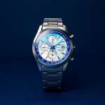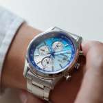 縦47.2×幅39.2mmと程よいサイズのステンレススチールケースに、平均月差±15秒のクオーツクロノグラフムーブメントを装備。ダイヤル外周を囲むフランジを彩る深い青色とダイヤルを彩るスカイブルーは、もちろんANAのコーポレートカラーに材を得たものですが、特に今回のモデルでは、細かなディテール部分にANAが開発段階から携わった“ボーイング787”の機体の特徴からインスピレーションを得たこだわりのデザインが光っています。