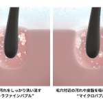 これら2種類の超微細な泡が肌や頭皮の汚れや油分を洗い流すのが「ファインバブルシャワーヘッド」の大きな特徴。ウルトラファインバブルが毛穴の奥の汚れをしっかりと洗い流し、さらにマイクロバブルが毛穴付近の汚れや皮脂に吸着し、浮上させることで、キメの整った肌と潤いのある美しい髪に整えます。