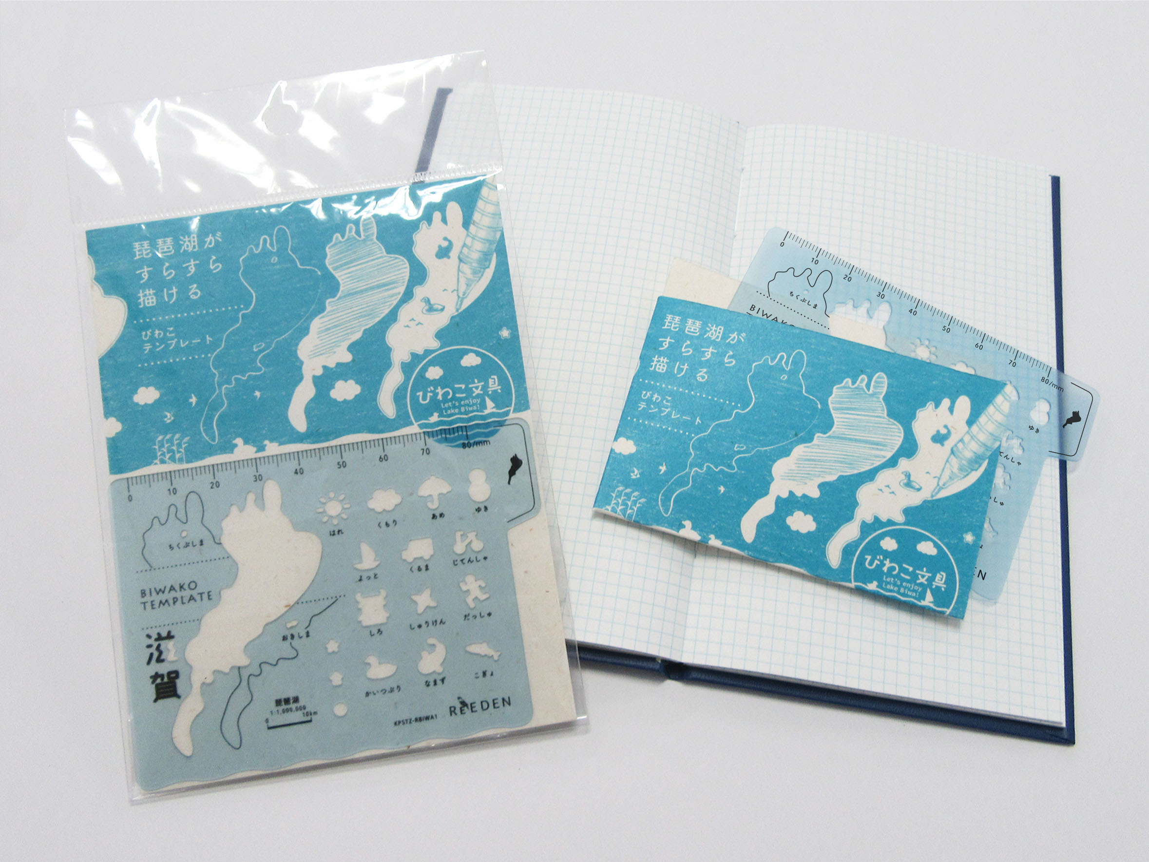 テンプレート本体は、琵琶湖らしい透明感のあるブルーの素材を採用。琵琶湖・淀川水系のヨシ紙を使用したパッケージ台紙は裏面の線に沿って組み立てると簡易的なテンプレートカバーとして使用できます。