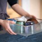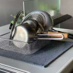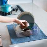 かご形状なので食器を重ねやすく、洗った食器をスムーズに置けます。実際にスタッフが試したところ、吸水タオルに直接置いた場合の半分の時間で洗い物が終わったそう。鍋やフライパンなど大きいものも収まるサイズはうれしいですね。