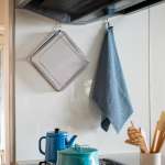 リング付きで、使い終わったら壁にかけて収納できます。キッチンの貴重な作業スペースのじゃまにならないのは、何よりの利点。自立するので、シンク下の引き出しなどに立てて収納もできます。