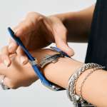 バンドの中心に施されたスリットのデザインは、objcts.ioの他製品にも施されている浮き出し加工と同様の形状によるワンポイントで、腕元の軽やかさも演出。