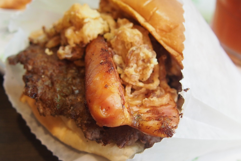 ソーセージは縦にカットされ、開いてトッピングされているのですが、それがハンバーバーがアッカンベーと舌を出しているようで、これはSNSでシェアしたくなるビジュアルですね。