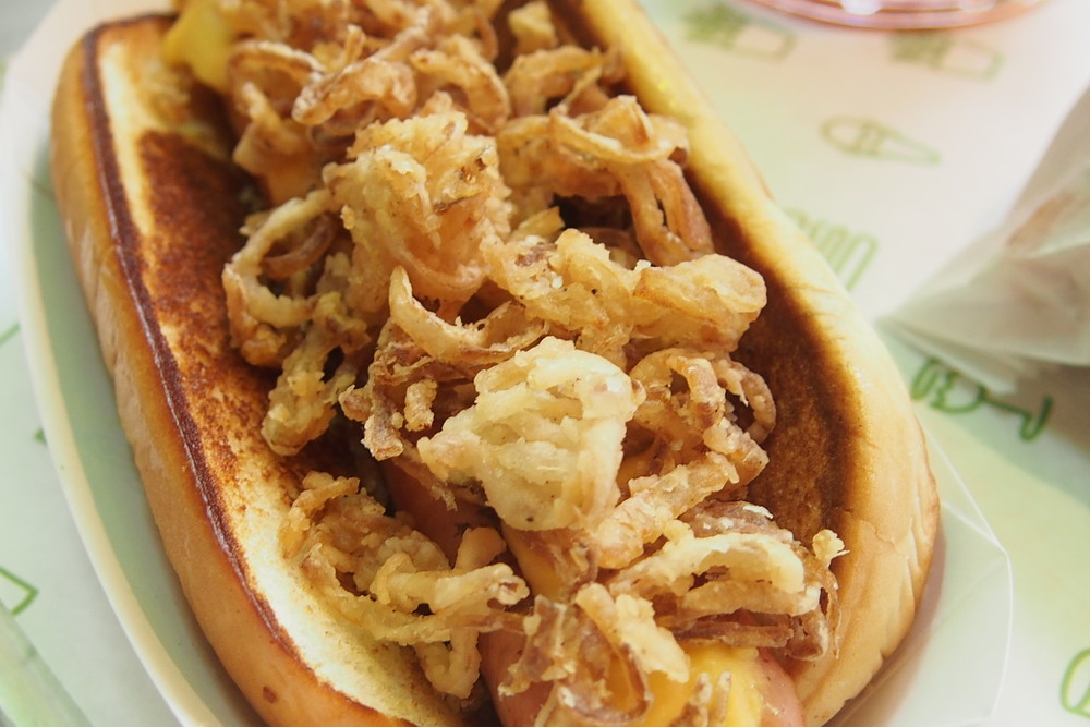 こちらは、ビールにマッチするチェダーソーセージとエシャロットのフライ、濃厚なチーズソースがたまらないホットドッグ。ほかの具材がまったく見えないぐらいかけられたエシャロットのフライをこぼさないようかぶりつきましょう。女性にはちょっとボリューム多すぎでは? と思ったものの、気がつけばぺろりとすべてお腹のなかでした。