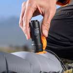 本体の大きさは直径2.6cm×長さ7.5cm。重さも電池込み(RCR123A/CR123Aリチウムイオン電池に対応)で約49g、電池なしで約33gと、持っていることを忘れてしまうほどの軽量仕様で、ズボンやバッグのポケット入れても、また付属のストラップを装着してバックパックに取り付けても、重さや嵩張りの負担を感じることはほぼありません。本体外装はアルミ合金製で落下による衝撃や擦過に強く、アウトドアのタフな環境下でも安心して携帯できます。