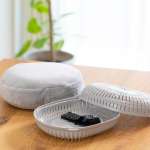 フレームとカバーの2点がセットになった「エフケーカバー」と、湯たんぽも付いた3点セットの「エフケーウォーマー」。低温やけどをおこしにくい、やさしい温度で温めてくれるセットです。セットになっていない湯たんぽを使用する場合、21×17×7cm以内のサイズなら収納できます。