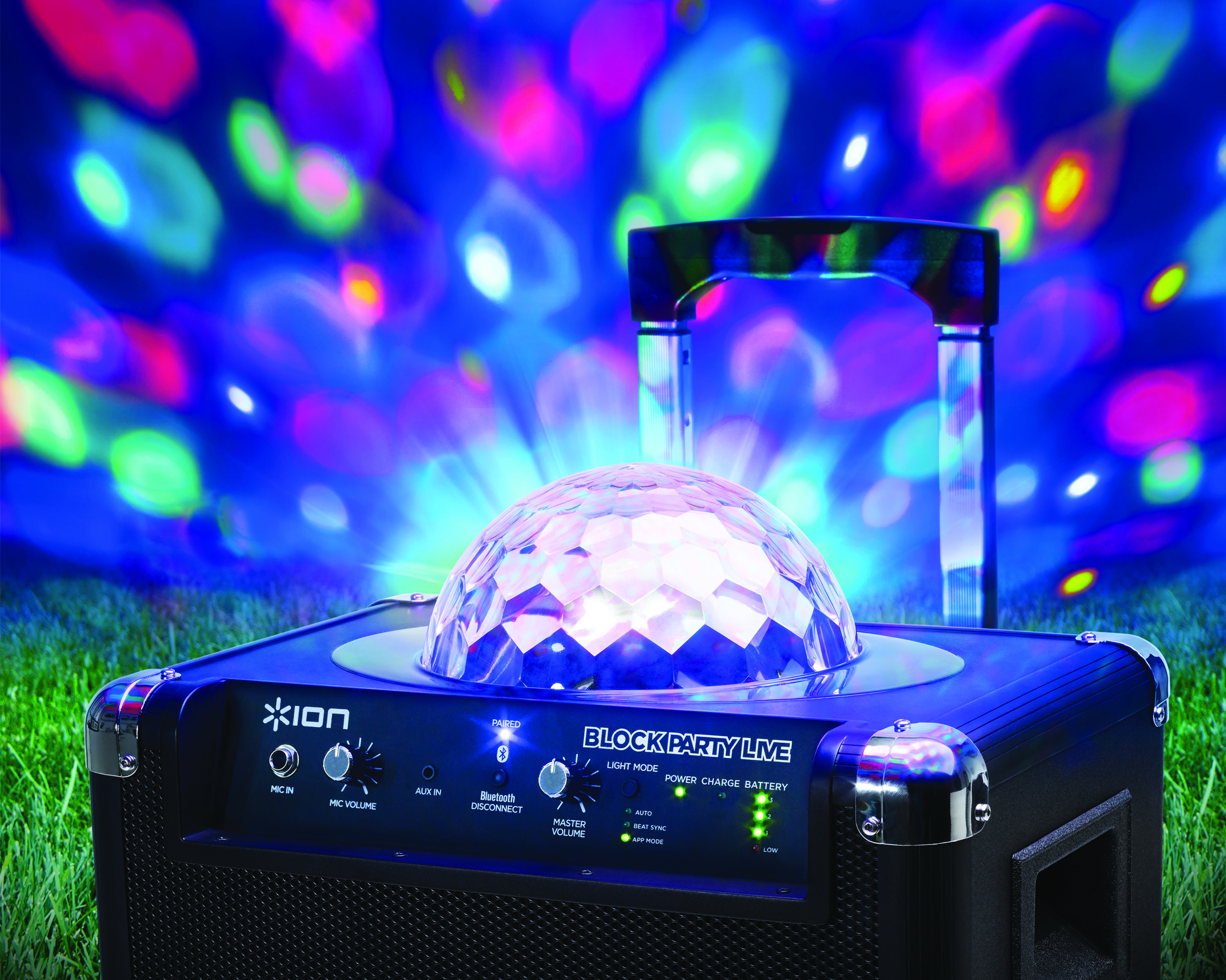 「Block Party Live」はポータブル型のPAシステム。注目のポイント、というよりは、いやでも注目してしまうのはスピーカーから顔をのぞかせるLEDライトドーム。