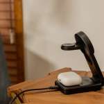 iPhone充電パッドの裏側に伸びる台にApple Watchを、土台部にAirPodsをケースごと置くことで、それぞれワイヤレス充電を行えるようになっています。本体に備わるLEDライトの点灯色で充電状況を、また光り方によって充電異常を知らせるステータスLEDを搭載。