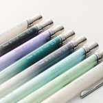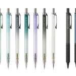 10周年記念モデルの通常タイプは“筆箱映え”を狙ったデザイン。透明感のあるクリアカラーのボディで、後軸からペン先に向けて次第に色が薄くなるグラデーション仕様。カラーリングは人気のニュアンスカラーを採用します。芯径別に組み合わせが異なり、透明のペンケースによく映えます。