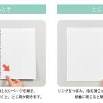 ページの差し替え・抜き差しを行うときは、交換したいページを開いて、左ページを上斜め、右ページを下斜めに軽く引くだけ。閉じ具のリングがパカッと開いてページの交換が可能に。作業が済んだら、リングをつまめば簡単に閉じられます。各リングを順番に指を滑らせて音がするようにすると、スムーズに閉じることが可能です。