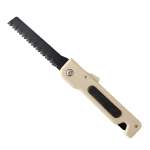 使用時のサイズは全長29cm×柄の高さ4.5cm×柄の厚み2cm×刃渡り10cm、折り畳み時は全長17cmとコンパクトに。刃の材質は炭素工具鋼とステンレス鋼、柄はABS樹脂+熱可塑性エラストマー。重さは150gで、折り畳み時は刃先が柄の内側に入るため安全に携帯できます。