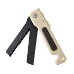 「karunoco」は刃を柄に収納できる折り畳み構造。ウェーブがかかった波刃と細かい切り刃を備えたノコ刃の2種類を搭載し、波刃は段ボールやカーペット、発泡スチロールといった柔らかな素材を、ノコ刃は木材やアルミ製のパイプ、薄厚の鉄、真鍮、プラスチックなど堅い素材の切断に適しています。