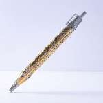 素材を活かした高級感あふれるカバーを装着すると、まさにボールペンが甲冑を纏ったような雰囲気。細部まで作り込まれた美しいデザインが目を引きます。