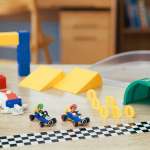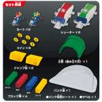 セット内容は、カート、専用シューター、土管トンネル、バンク坂、ジャンプ台、コイン、ブロック棒。マリオカートのサーキットが自分のお部屋に作れる対戦パーツが揃っています。