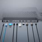 本製品は本体に付属しているUSB Type-Cケーブル1本のみでノートPCと接続可能。HDMI出力端子2個とUSB Type-Aポート2個、Type-Cポート2個、有線LANポート、SDカード、Micro SDカード、3.5mmオーディオ、USB Power Delivery(USB PD)入力ポートを各1個備えています。そのため、11個のポートとの接続は、ノートPCと接続するType-Cケーブル1本だけなので、外出や会議などで面倒な取り外し・再接続の手間がかかりません。