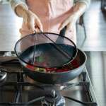 また調理中に茹でた野菜やパスタなどの湯切りにも使える点も魅力的。わざわざザルを出さなくても、思い立ったらササっと使えるのもいいですね。1つあれば油ハネから湯切りまで幅広く対応できます。