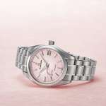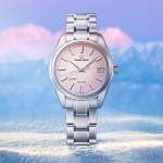 一方ダイヤルには、スプリングドライブムーブメントのふるさとである「信州 時の匠工房」から望む穂高連峰の雪面に形作られる風紋から着想を得た繊細なパターンを採用。淡い薄紅色のグラデーションは、朝焼けに美しく染まる雪原をイメージしています。