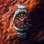 こちらは同じく「信州 時の匠工房」より望む穂高連峰の夏をイメージ。険しい岩肌が鮮やかな朝日に照らされる朝焼けの情景を、ブラックのベゼルとダークレッドのダイヤルで表現しています。