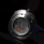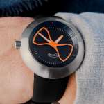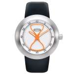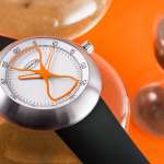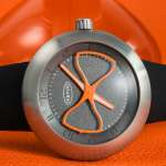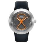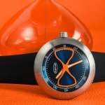 46mm径・17mm厚の巨大な円盤型ステンレススチールケースの中には、これもアイコニックなフォルムのオレンジ×ホワイトの時分針を備えますが、これに重ねるようにしてセンターに据えられているのは砂時計のアウトラインをかたどった秒針。