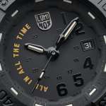 特徴的なブラックアウトデザインと「NAVY SEAL 3500 SERIES」のフォルムを持つ今回の限定モデルは、文字盤に、モデル名であり、またアメリカ海軍特殊部隊隊員の“マントラ(真言)”にしてミッション遂行前に行うコール&レスポンスでもある「ALL IN ALL THE TIME(いつでも全力を尽くす)」をゴールドカラーで配置。