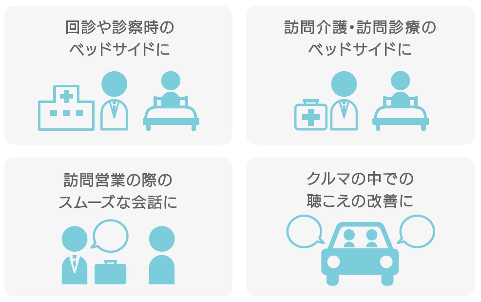 医療現場においては診療時や訪問看護でのベッドサイドでの使用を想定していますが、営業先でのプレゼンや車内など周りが騒がしい環境など、よりクリアに相手に伝えたい、聞きたいと思うシーンでも役立ちそうです!