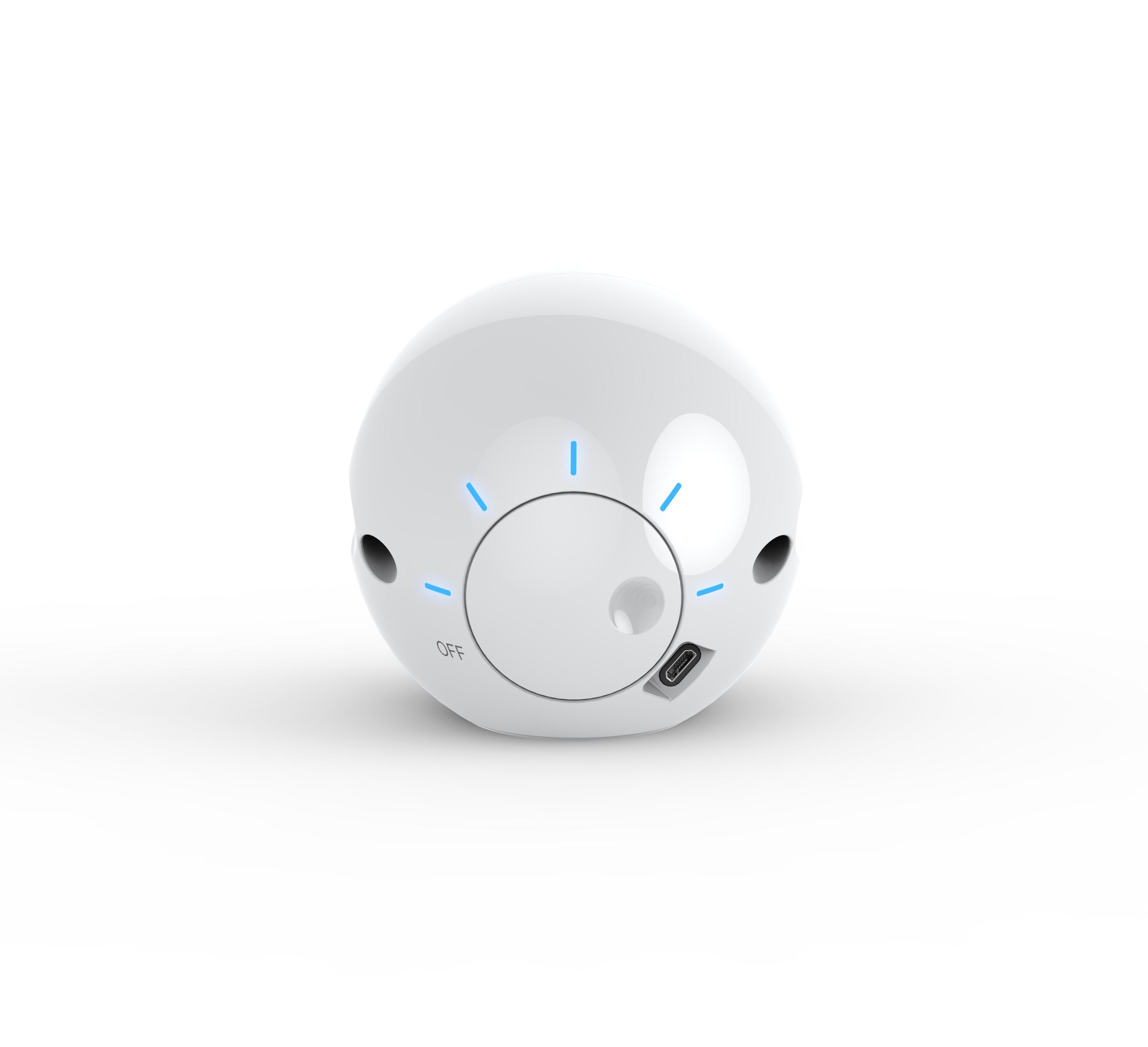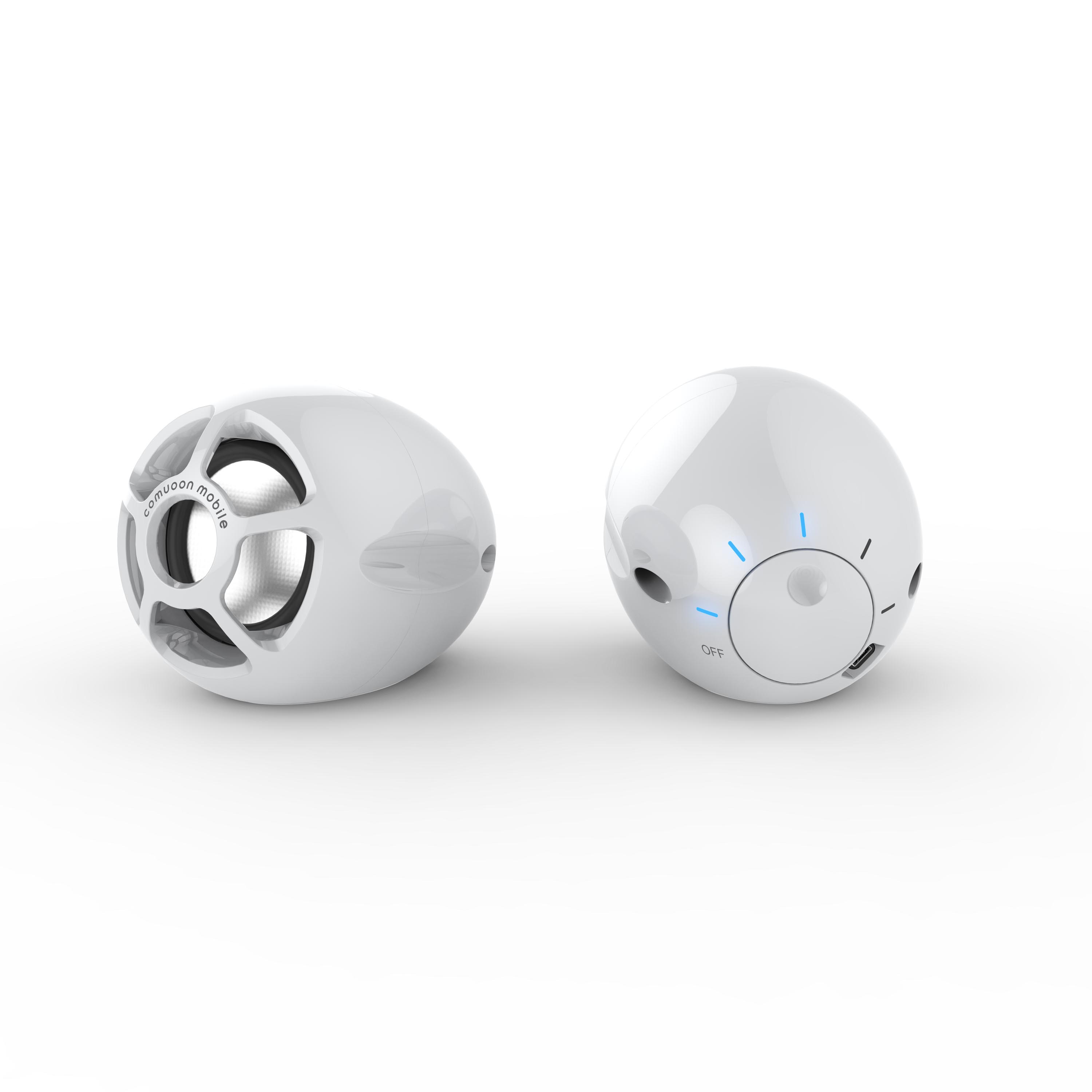 今回登場した「comuoon mobile」は持ち運びに便利なポータブルタイプ。Micro USB ケーブルによる給電で、約3時間の充電でおよそ4時間使うことができます。持ち運びの負荷を軽減するために製品サイズを極限までシェイプし、アンプ部とスピーカーを一体化したのですが、結果としてコロンとした可愛らしい外見につながっています。