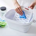つけ置き洗いに特化した折りたたみバケツなので、使わないときは折りたたむことができ、隙間収納が可能。洗面台で使用できるコンパクトサイズなので、面倒な水くみの手間がかからず、とにかく便利。これなら面倒なつけ置き洗いも苦になりません。