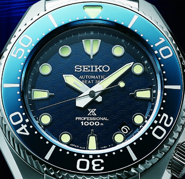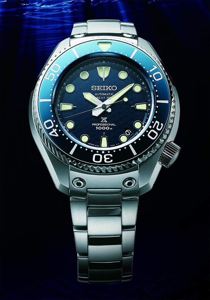 また、もう一つの注目ポイントはデザイン。およそ40年にわたり時計のデザイン開発に関わってきたウオッチデザイナーの小杉修弘氏が手掛けており、波を表す伝統文様「青海波(せいがいは)」をあしらったネイビーのダイヤルとブルー硬質コーティングのベゼルが、深遠な海の情景を思い起こさせます。